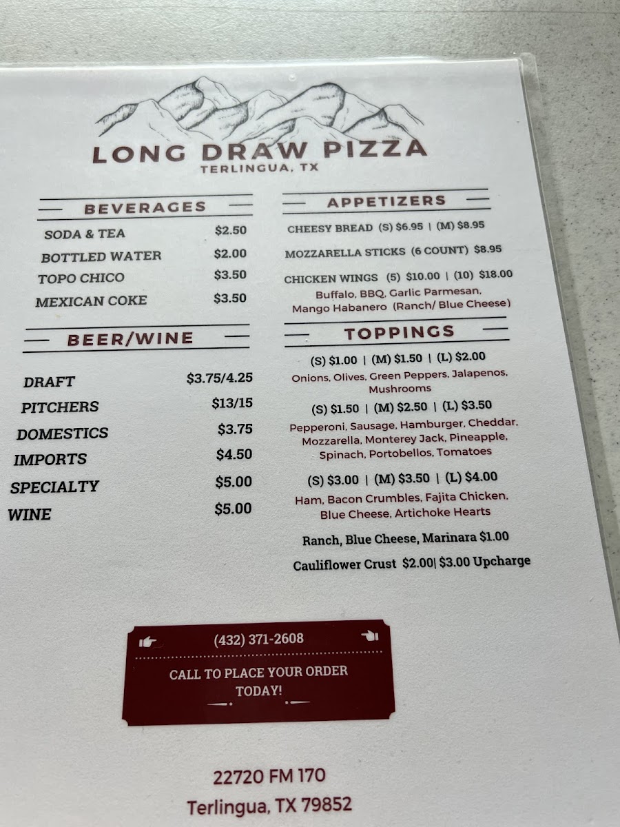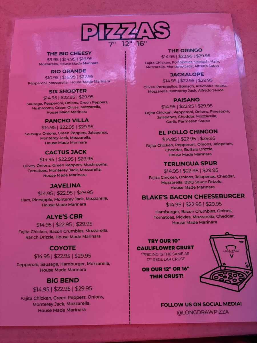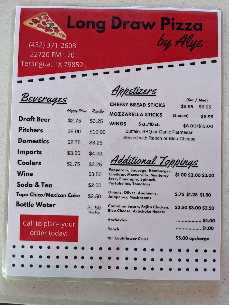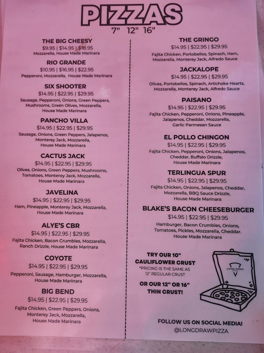 Welcome to Long Draw Pizza, a hidden gem nestled in Terlingua, TX, where flavorful pizzas meet a charming atmosphere. The menu offers a delectable range of options, each pie crafted with fresh ingredients. Highlights include the Six Shooter Pizza, bursting with pepperoni, sausage, and olives, and the spicy Pancho Villa Pizza, featuring jalapenos and Monterey jack cheese. If you're in the mood for something lighter, try the Cactus Jack Pizza with Monterey jack and sliced tomatoes.