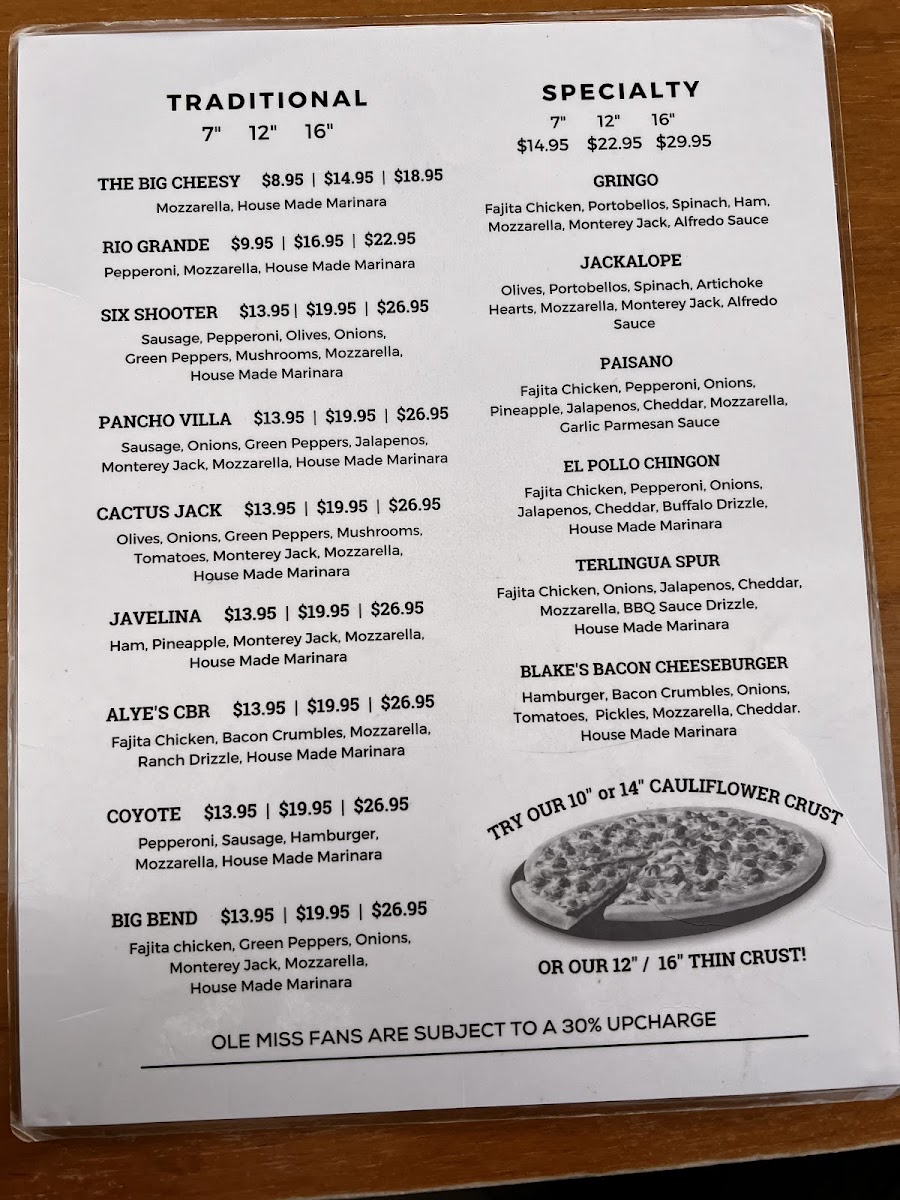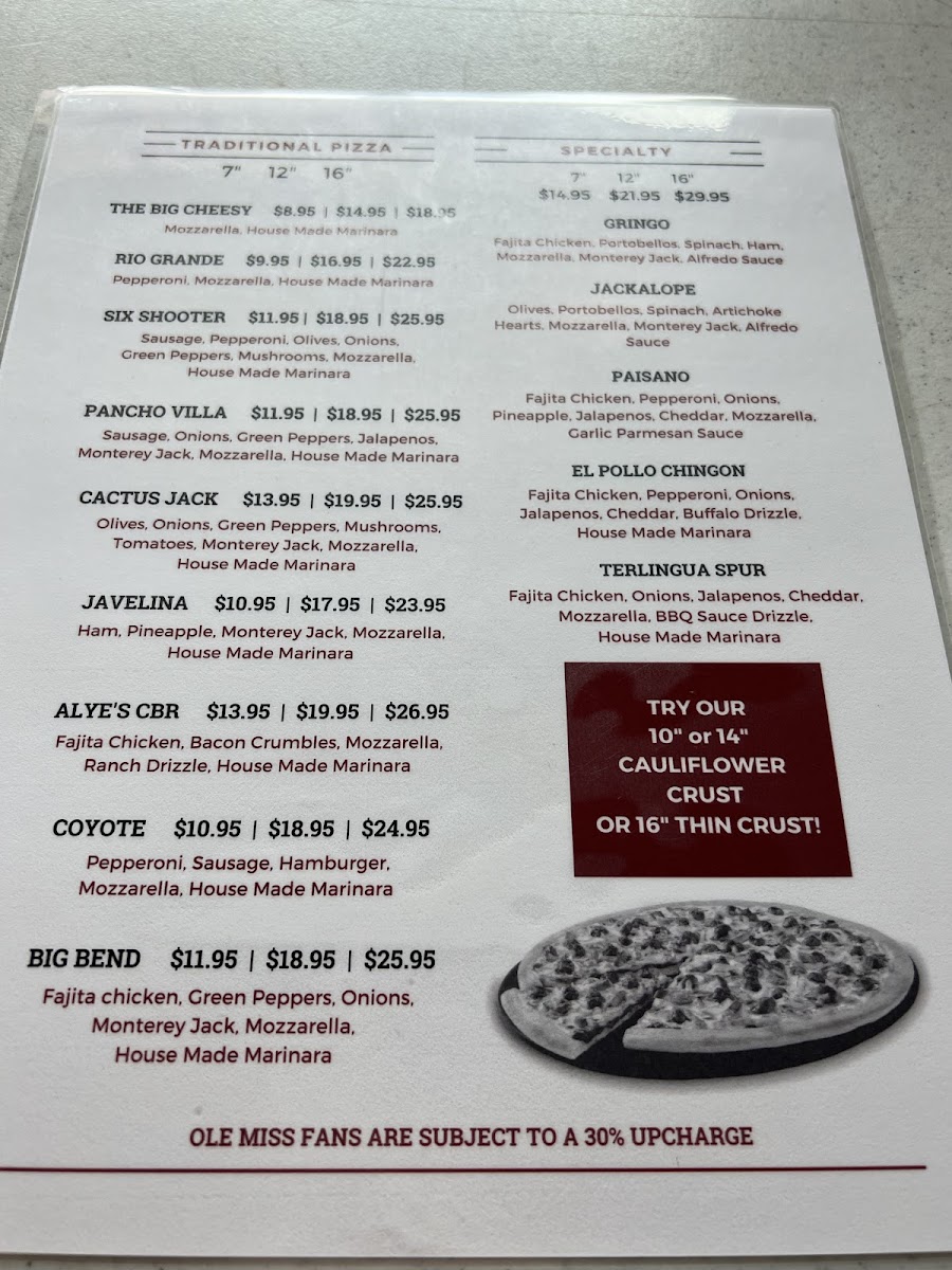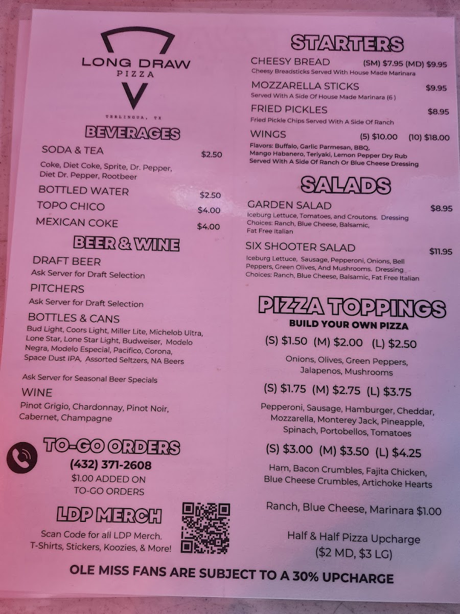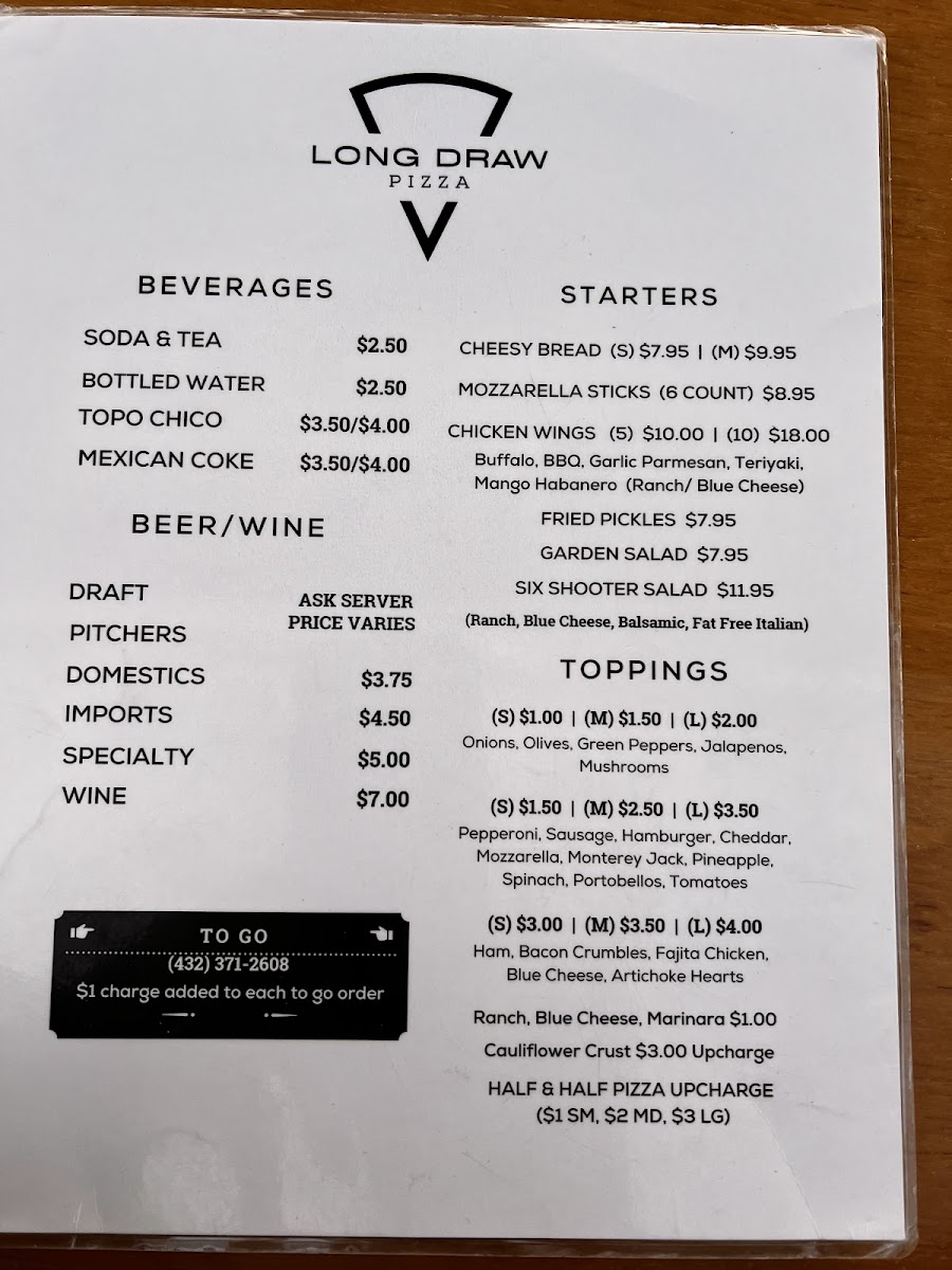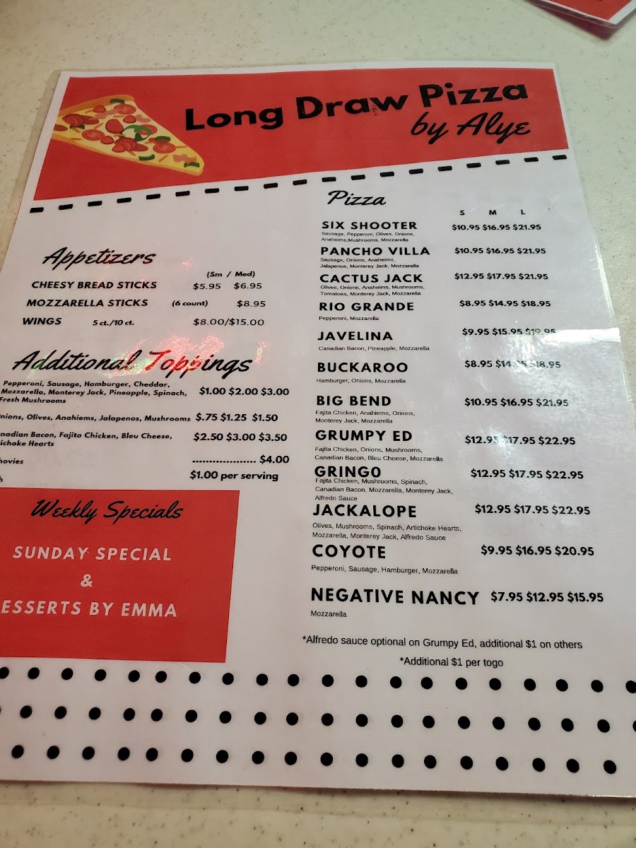 Welcome to Long Draw Pizza, a hidden gem nestled in Terlingua, TX, where flavorful pizzas meet a charming atmosphere. The menu offers a delectable range of options, each pie crafted with fresh ingredients. Highlights include the Six Shooter Pizza, bursting with pepperoni, sausage, and olives, and the spicy Pancho Villa Pizza, featuring jalapenos and Monterey jack cheese. If you're in the mood for something lighter, try the Cactus Jack Pizza with Monterey jack and sliced tomatoes.